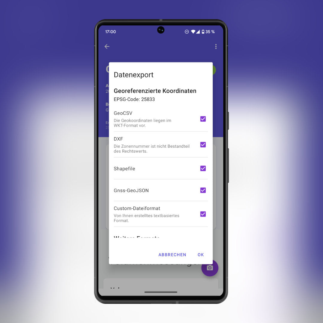 Neben der PDF-Dokumentation können die Messdaten in verschiedenen Standardformaten exportiert werden, darunter GeoCSV, GeoJSON, Shape und DXF. Dadurch wird eine nahtlose Weiterverarbeitung in anderen Systemen ermöglicht.